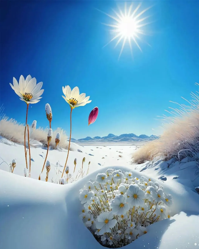 Nature’s Resilience: Blossoming Flowers Amidst a Snow-Clad Forest